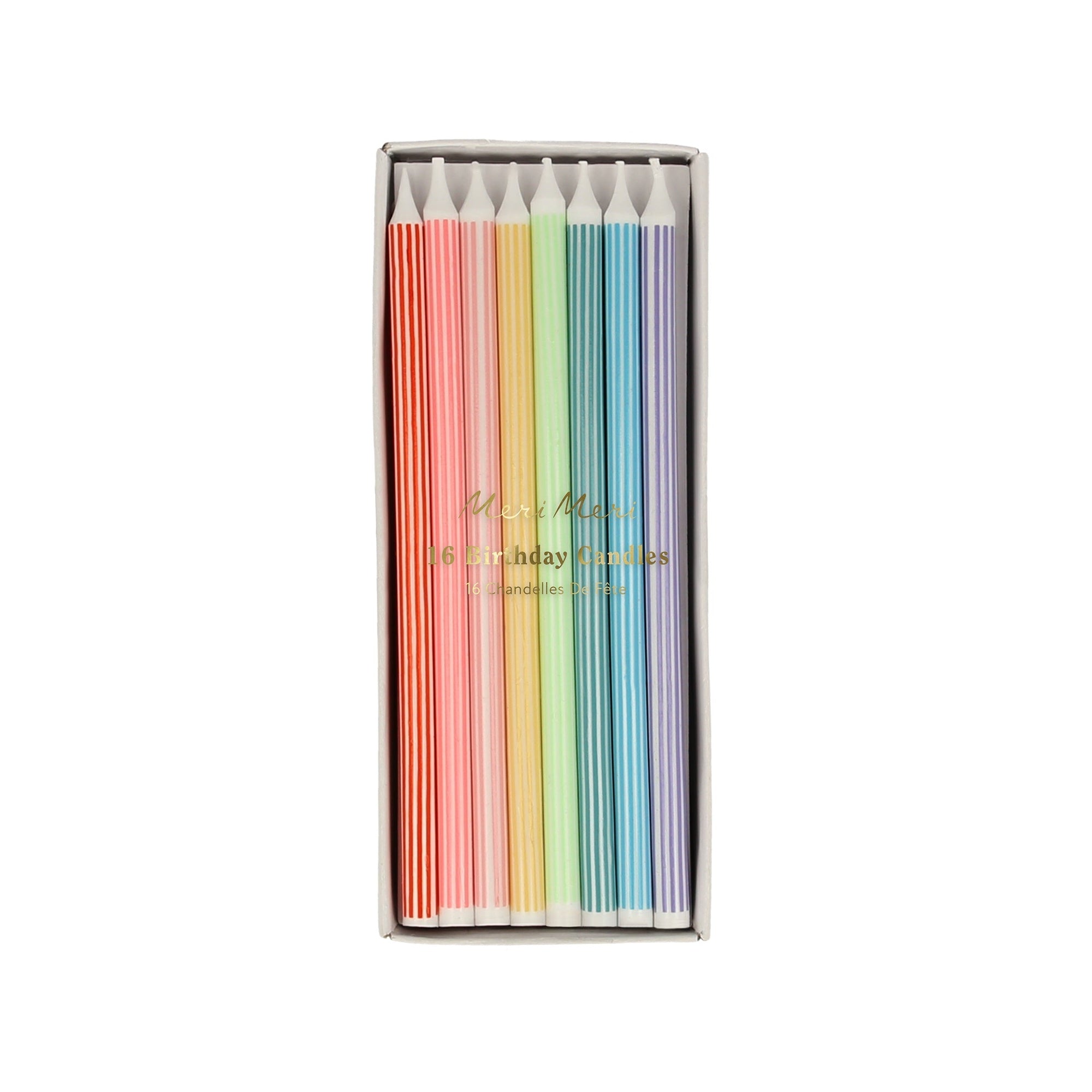 Make a statement with stripes! Our sensational striped candles are perfect to light up your party cakes. The rainbow choice of colors will suit any party theme. Product OverviewDimensions: Candle height : 5.75"H.