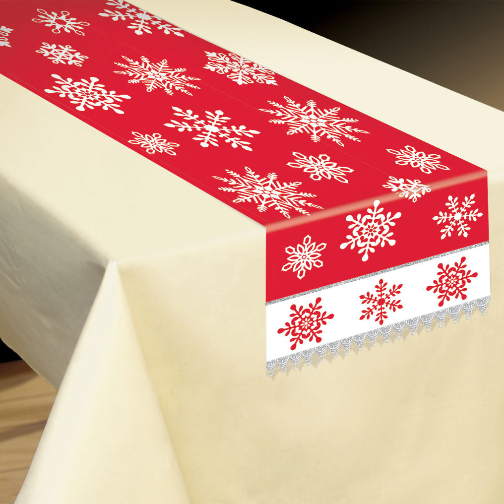 Christmas Red and White Snowflake Table Runner with Silver Metallic Trim, Red/White