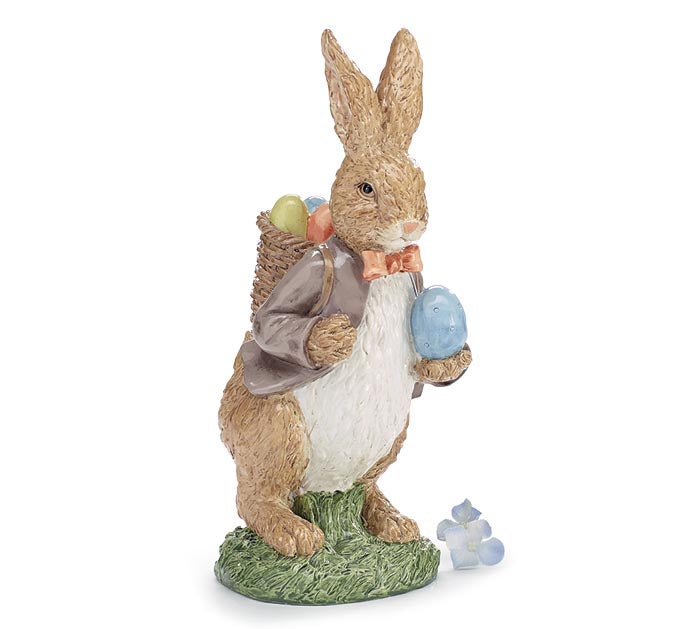 Male rabbit standing resin figurine. The rabbit is brown and white and wearing a grey jacket with a peach bow tie. The rabbit is holding a blue egg and carrying a basket of eggs on his back.