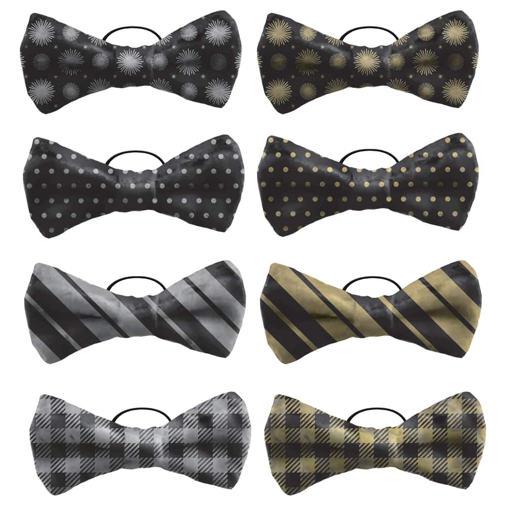 These adorable gold and silver fabric loops from Amscan are made for flutes and feature eight unique black, silver, and gold designs so guests don't lose their glasses. Now, guests' champagne glasses will be elegantly dressed for your celebration. Elastic bands attached, fabric, Dimensions: 3.5 L x 1.5 W in (8.9 x 3.8 cm), Pack of 8 drink markers.