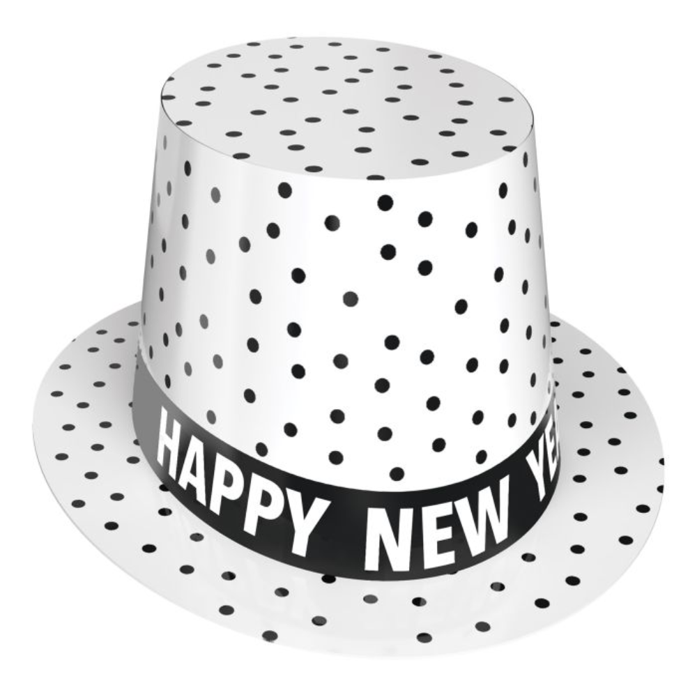 The New Year Tux Hi-Hat brings timeless elegance to your celebration. This sophisticated top hat features classic black styling with a refined satin finish, perfect for formal events, New Year's Eve galas, or upscale costume occasions. The one-size-fits-most design ensures a comfortable fit for virtually any guest. Ideal for adding a touch of dapper charm to tuxedo ensembles or formal attire, this hat elevates any sophisticated gathering with understated luxury and polished style.