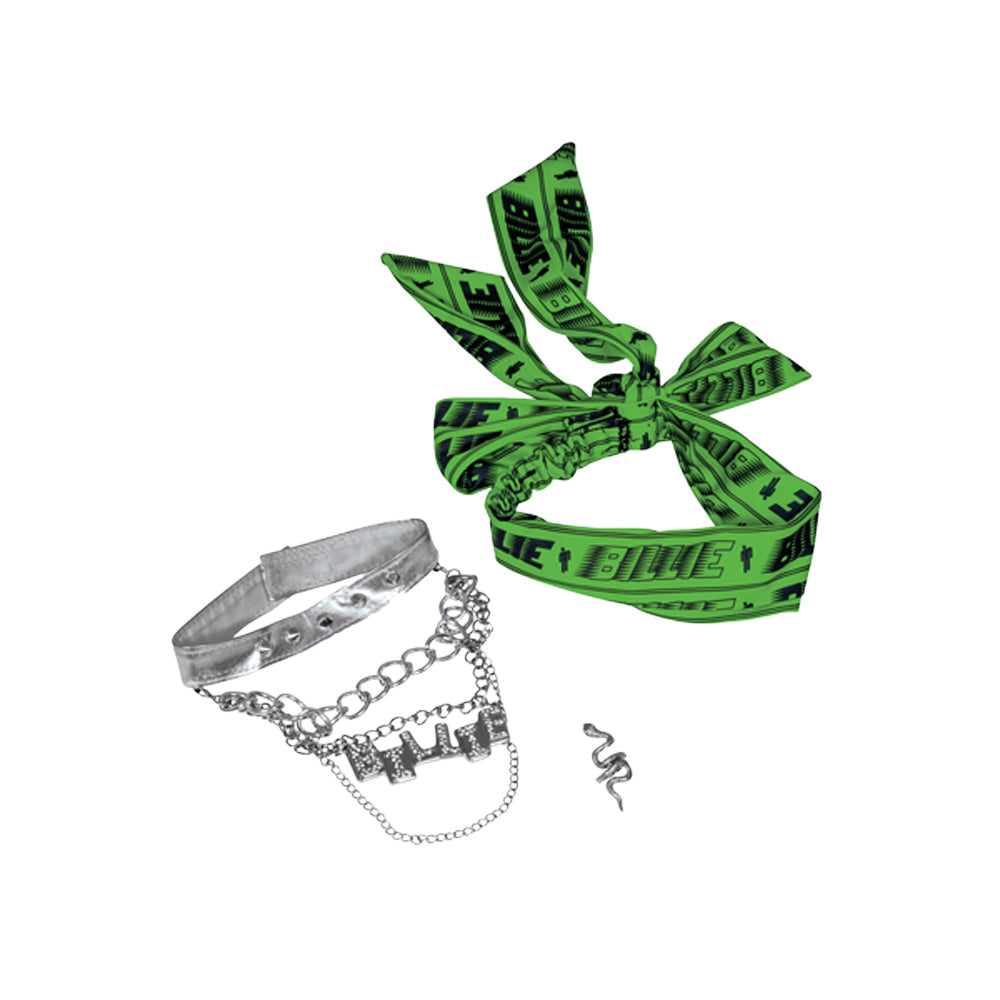 Create the iconic look of Billie Eilish. Embrace the boldness and transform into one of the biggest breakout musicians to rock the stage. Who isn’t obsessed with Billie The Adult Billie Eilish Kit includes a green headwrap, necklace, and Billie Eilish metal ring. One size fits most adults. This is an officially licensed Billie Eilish costume accessory.. Features Green headwrap; Metal pendant ring; One size fits most adults; Officially Licensed; Specifications Gender: Womens; .