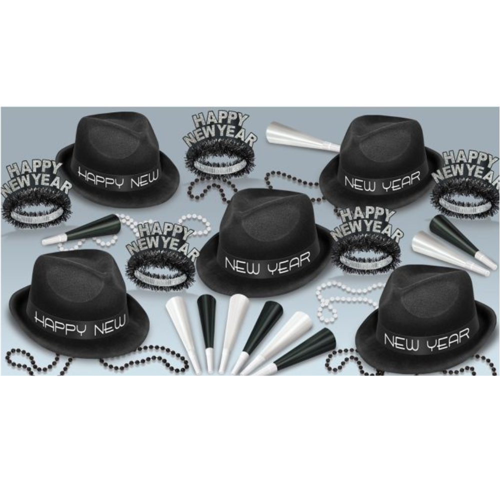 This comprehensive party assortment delivers everything needed to outfit a group celebration with coordinated elegance and festive flair. The set includes five plush velour chairman hats featuring eye-catching printed foil bands that command attention, complemented by five ornate fringed tiaras for added sophistication. Ten 9-inch foil horns provide classic noisemaker fun, while five 33-inch strands of party beads complete the ensemble with traditional celebratory style. Ideal for New Year's Eve galas, corporate events, or milestone celebrations, this curated collection ensures your guests arrive fully accessorized and ready to celebrate in grand fashion.