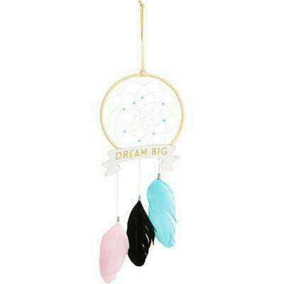 Encourage happy dreaming by gifting your grad this Dream Big Dream Catcher. This dream catcher puts a spin on the classic by featuring a Dream Big curved banner attachment and blue black and pink feathers. Have them hang this dream catcher above their headboard so nightmares don't impede on their big dreams! Dream Big Dream Catcher product details: 5in wide x 13in tall Attached loop 4in drop length.