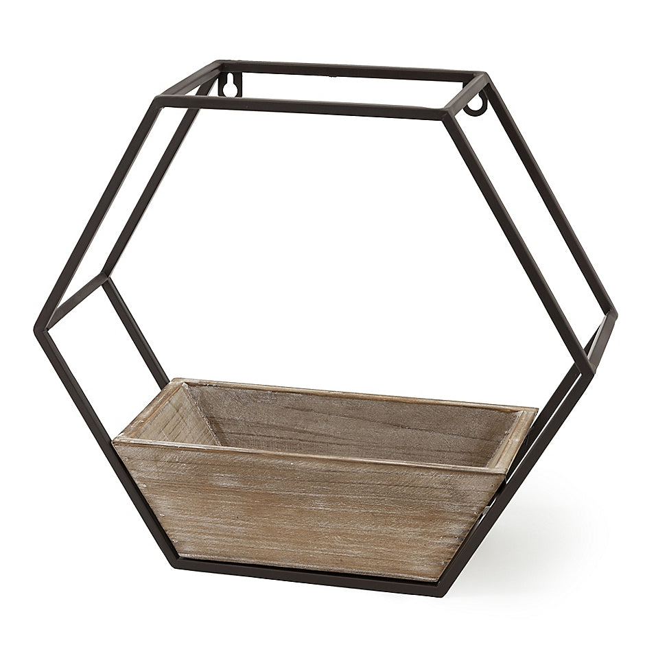 Show off your faux plants in style with the Hexagon Indoor Wall Planter from Boston International. Black metal 3D hexagon frame holds a natural wood basin at the bottom for floral displays or holding small items like keys and sunglasses.