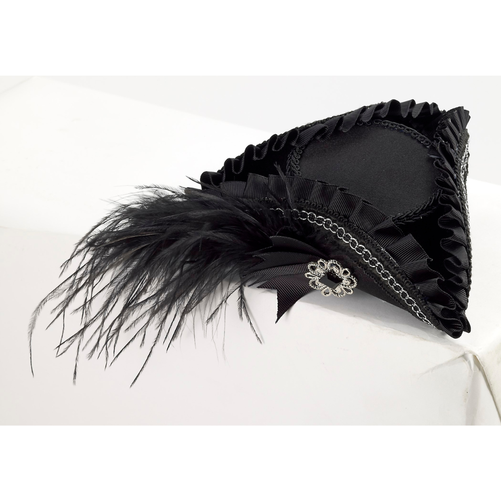This black mini tri-corner hat adds vintage flair to any look, from swashbuckling pirate to powdered patriot. With its dainty size and classic style, it’s perfect for costumes, cosplay, or theatrical flair.