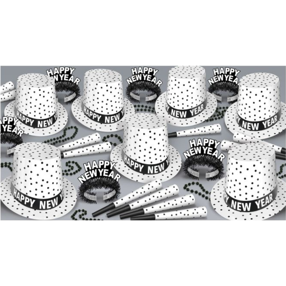 Ring in the new year with style using this comprehensive party assortment designed for 50 guests. This curated collection includes 25 printed hi-hats for classic elegance, 25 printed fringed tiaras adding glamorous flair, 50 nine-inch printed horns for celebratory noise-making, and 25 strands of 33-inch party beads for festive layering. Perfect for New Year's Eve galas, formal celebrations, or upscale themed events, each piece coordinates seamlessly to create a sophisticated, coordinated look. Ideal for venues hosting medium to large gatherings where uniform party wear enhances the overall ambiance and guest experience.