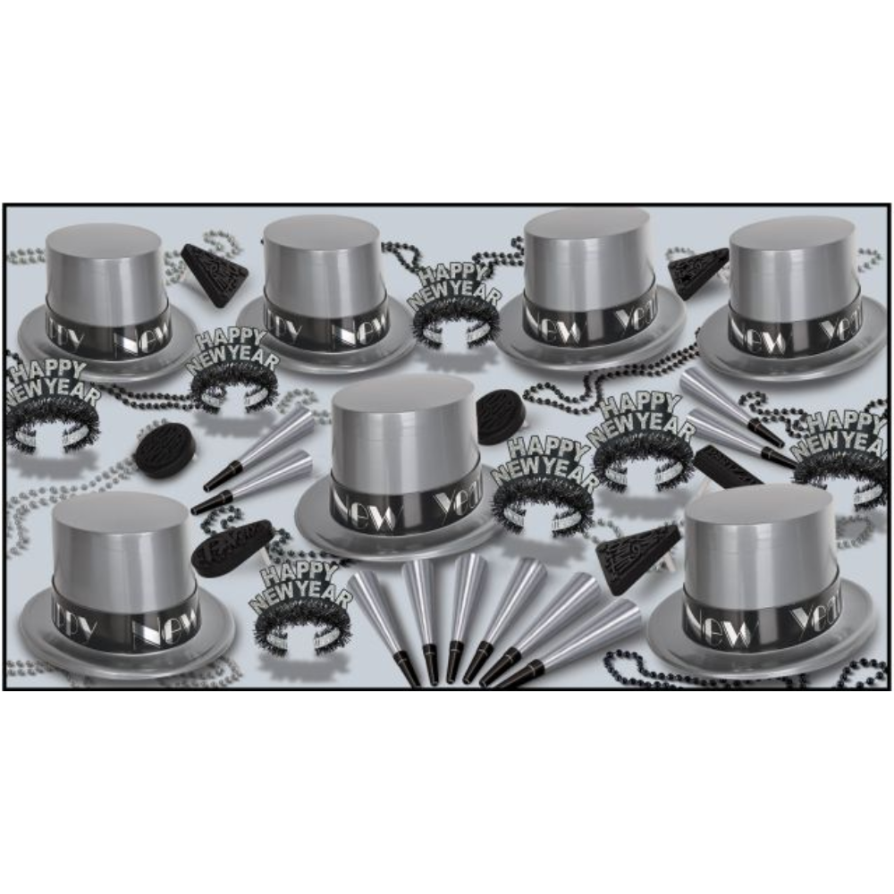 Simply Silver Asst for 50 Celebrate in style with this comprehensive silver party assortment designed for groups of 50 guests. This curated collection includes 25 plastic toppers featuring printed foil bands, 25 fringed tiaras for elegant flair, 30 nine-inch foil horns to amplify the festivities, 20 deluxe noisemakers for interactive fun, and 25 thirty-three-inch party beads to complete the look. Each component combines quality construction with coordinated silver aesthetics, making setup effortless and ensuring every guest has the essentials for a memorable celebration. Perfect for New Year's Eve, milestone birthdays, corporate events, or any occasion calling for coordinated party décor and accessories.