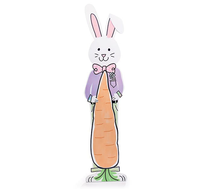Wooden Easter bunny holding a carrot porch sign. The bunny is wearing a purple shirt and has a pink bow tie.36"H X 8.25"W